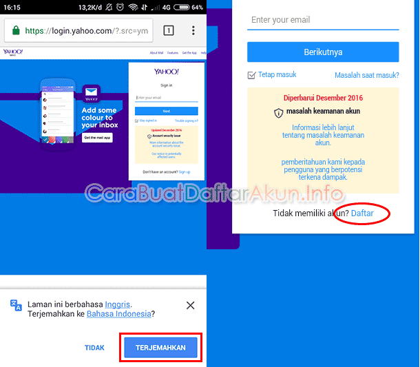 Cara Buat Email YAHOO lewat HP Android tanpa aplikasi dengan browser Opera Mini, UCBrowser, Chrome, Mozilla dll masuk ke daftar email Yahoo Bahasa Indonesia